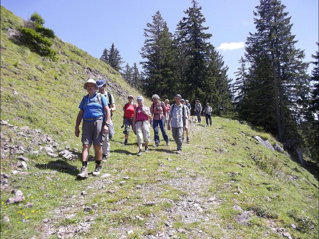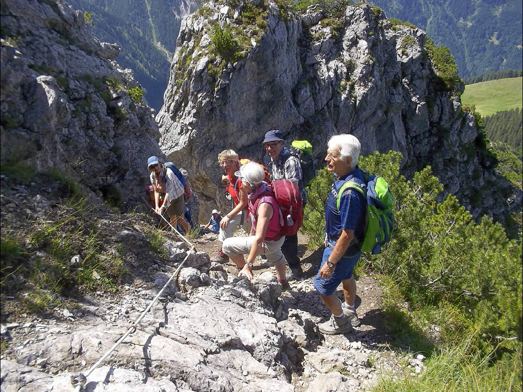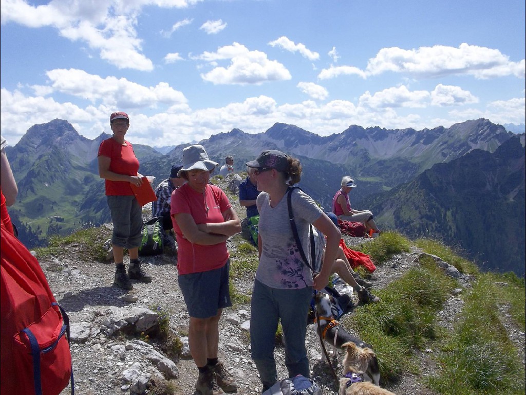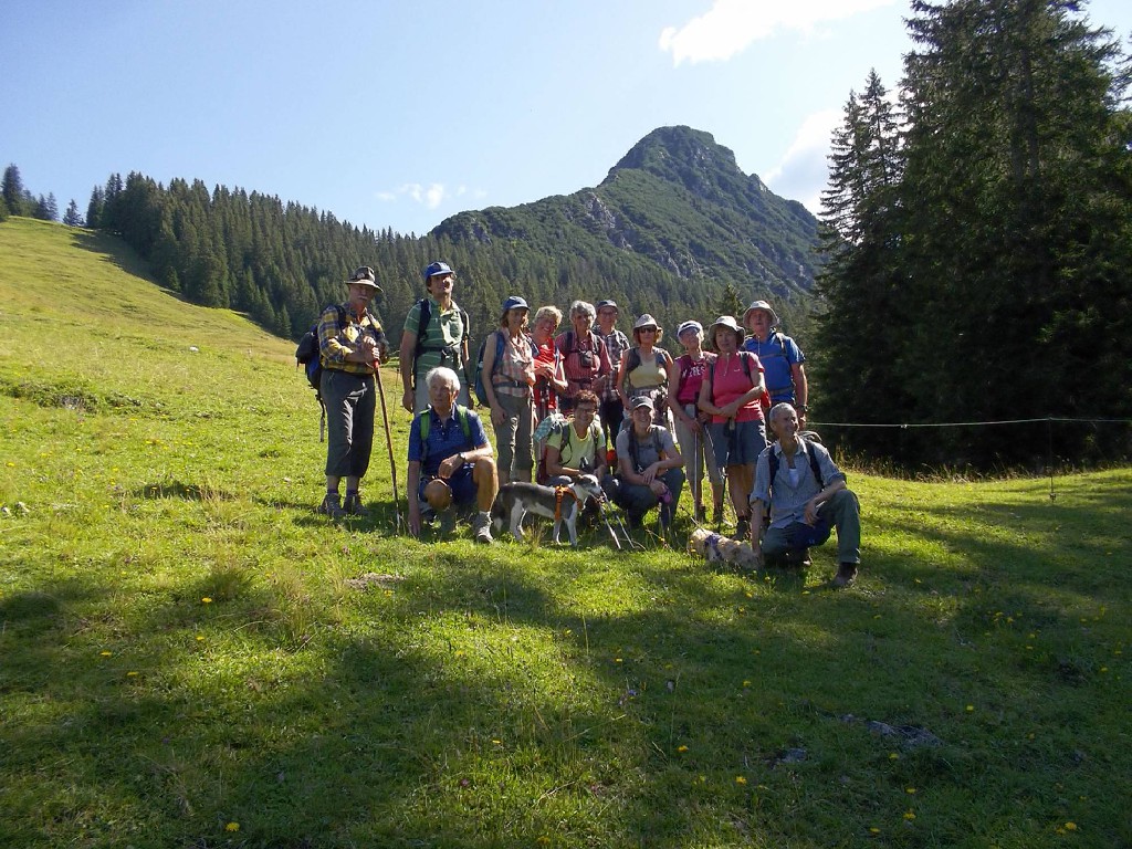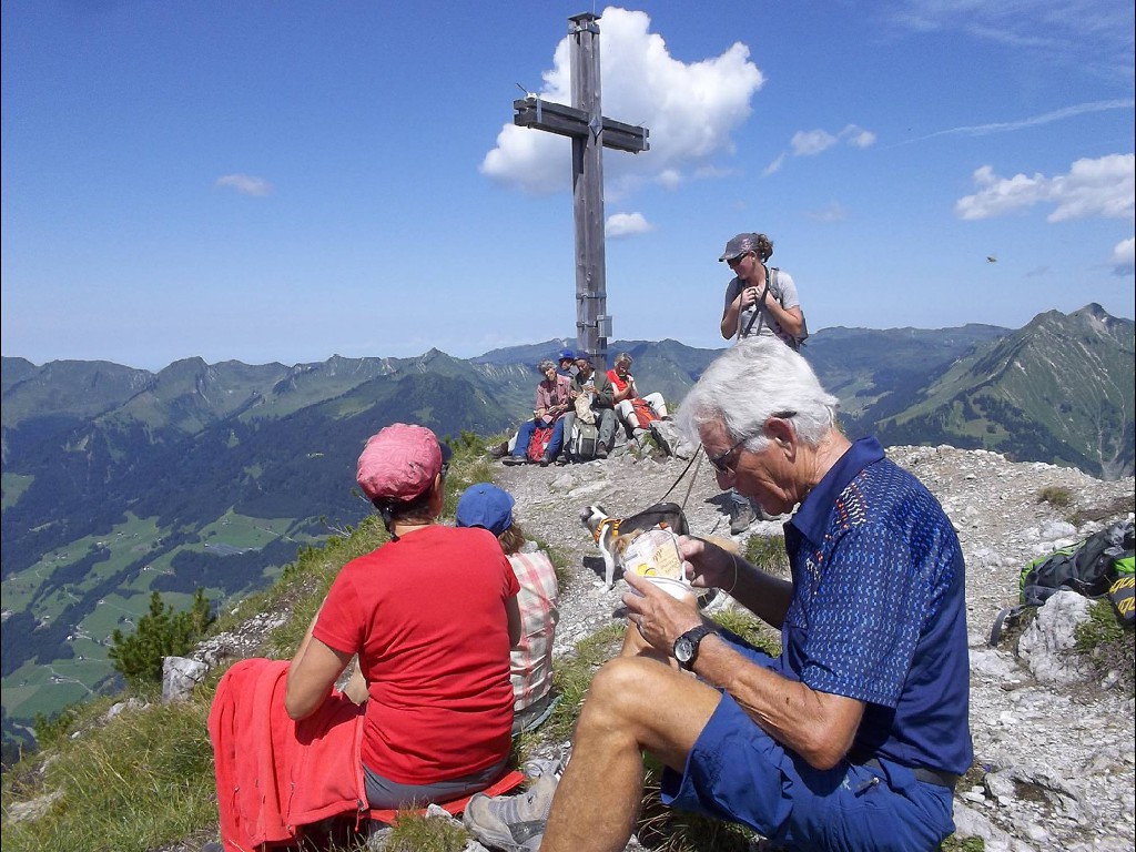 In der Nacht hatte es zwar heftig geregnet, doch der Aufstieg bis zur Stafelfederalpe war ein leichtes, und von dem Angebot einer kurzen Einkehr vor dem Gipfelsturm, waren alle begeistert. Vierzehn Personen an der Zahl, damit hatte die junge Milchbäuerin nicht gerechnet und kam kaum nach mit Milch ausschenken. Nach dieser Stärkung konnte es so richtig zur Sache gehen und man hat sich darauf vorbereitet, sicher und mutig in die Seile zu steigen. Unsere Kolonne, die in einsamer Bergwelt endlos zu sein schien, schreckte die Einheimischen Sonntagswanderer ganz schön auf, und wir mussten Rücksicht nehmen auf Entgegenkommende, die wir, in den Seilen hängend, vorbei lassen mussten. Solche Wandergruppen waren die Menschen im Großen Walsertal wohl nicht gewohnt. Am Gipfel angelangt hatten wir dann unsere Ruhe und genügend Platz, uns auszubreiten für ein deftiges Rucksackvesper, was ein jeder verdient hatte. Wir waren ein gutes Team und erfahrene Bergwanderer, diesmal war alles dabei, Alt und Jung, Gäste und Mitglieder und sogar ein Zwillingspaar. Siggi, die Jüngste, mit ihren beiden kleinen Hunden als Begleiter, wie sie das geschafft hatte, ihre Lieblinge an der Leine am Bauchgurt züchtig und brav dort hoch zu führen, mit viel Geschick und Geduld, das war schon eine besondere Leistung, nicht einfacher beim Abstieg, da führten dann auch schon mal die Hunde ihr Frauchen.