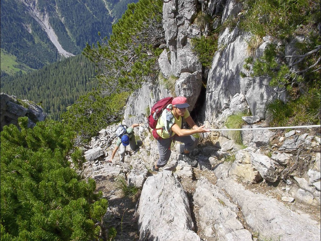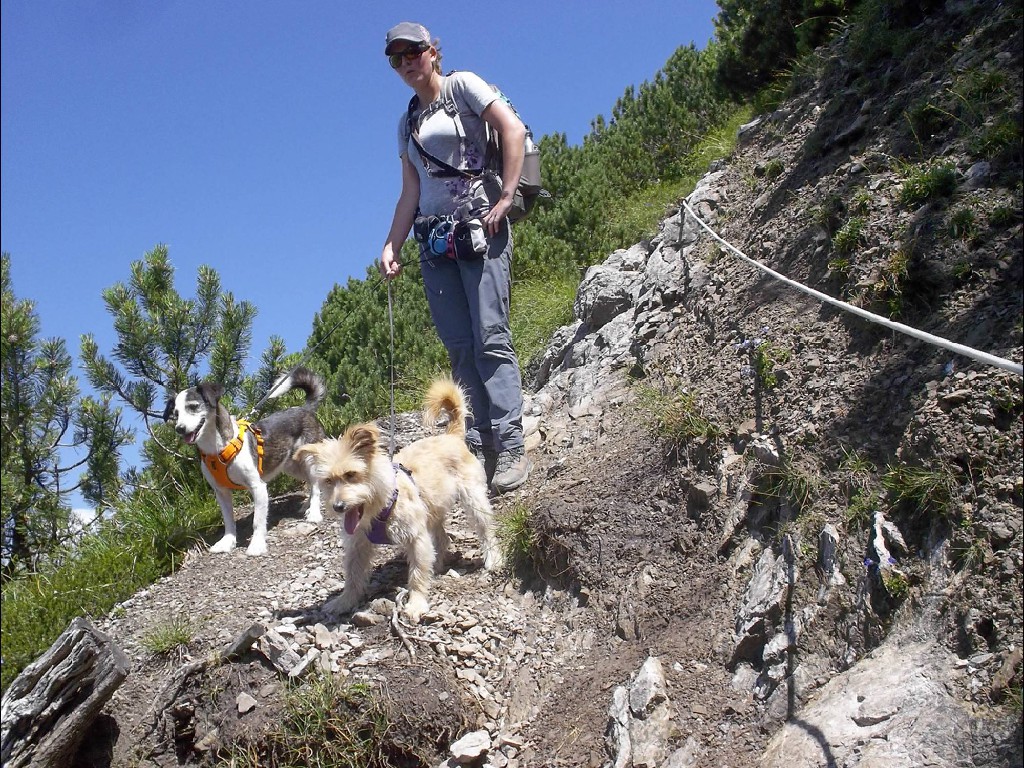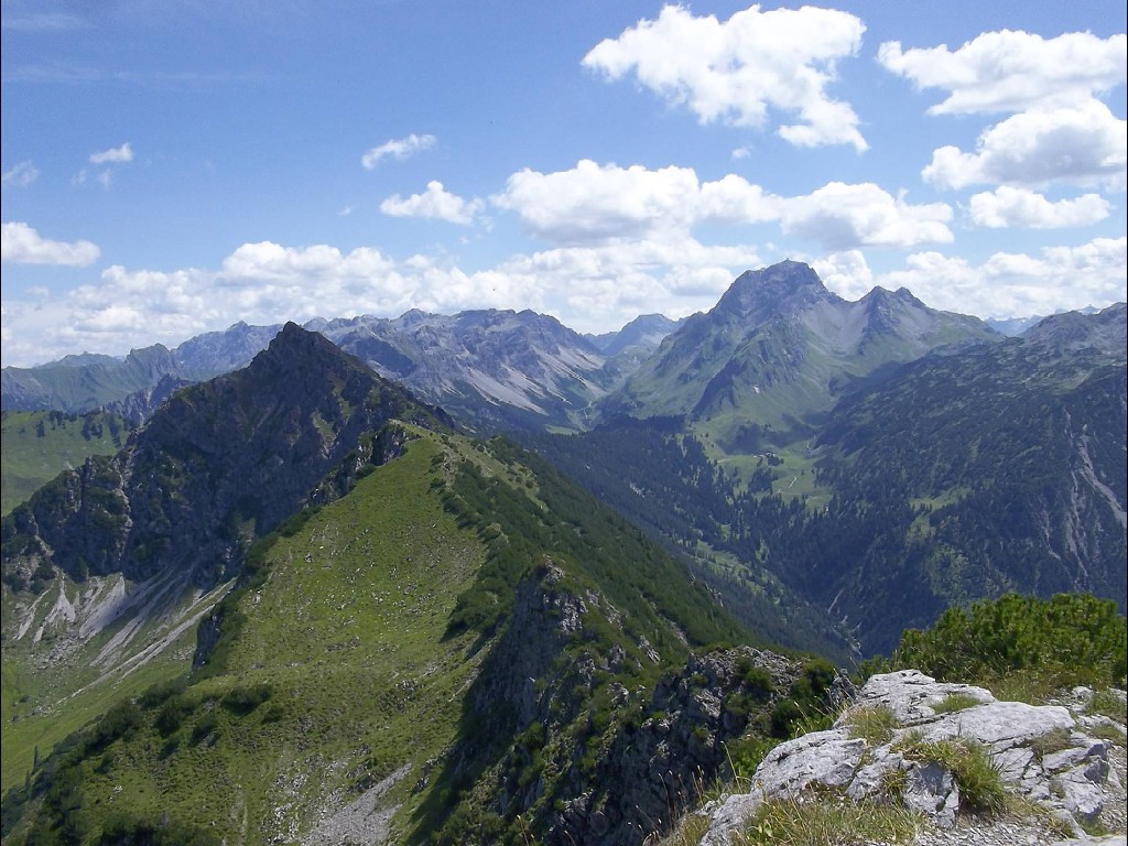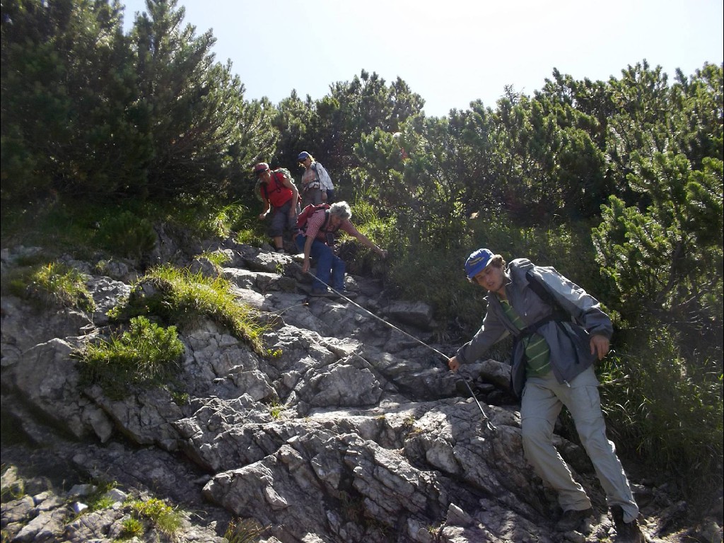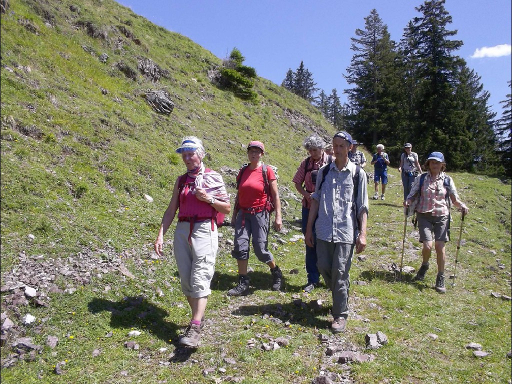 In der Nacht hatte es zwar heftig geregnet, doch der Aufstieg bis zur Stafelfederalpe war ein leichtes, und von dem Angebot einer kurzen Einkehr vor dem Gipfelsturm, waren alle begeistert. Vierzehn Personen an der Zahl, damit hatte die junge Milchbäuerin nicht gerechnet und kam kaum nach mit Milch ausschenken. Nach dieser Stärkung konnte es so richtig zur Sache gehen und man hat sich darauf vorbereitet, sicher und mutig in die Seile zu steigen. Unsere Kolonne, die in einsamer Bergwelt endlos zu sein schien, schreckte die Einheimischen Sonntagswanderer ganz schön auf, und wir mussten Rücksicht nehmen auf Entgegenkommende, die wir, in den Seilen hängend, vorbei lassen mussten. Solche Wandergruppen waren die Menschen im Großen Walsertal wohl nicht gewohnt. Am Gipfel angelangt hatten wir dann unsere Ruhe und genügend Platz, uns auszubreiten für ein deftiges Rucksackvesper, was ein jeder verdient hatte. Wir waren ein gutes Team und erfahrene Bergwanderer, diesmal war alles dabei, Alt und Jung, Gäste und Mitglieder und sogar ein Zwillingspaar. Siggi, die Jüngste, mit ihren beiden kleinen Hunden als Begleiter, wie sie das geschafft hatte, ihre Lieblinge an der Leine am Bauchgurt züchtig und brav dort hoch zu führen, mit viel Geschick und Geduld, das war schon eine besondere Leistung, nicht einfacher beim Abstieg, da führten dann auch schon mal die Hunde ihr Frauchen.