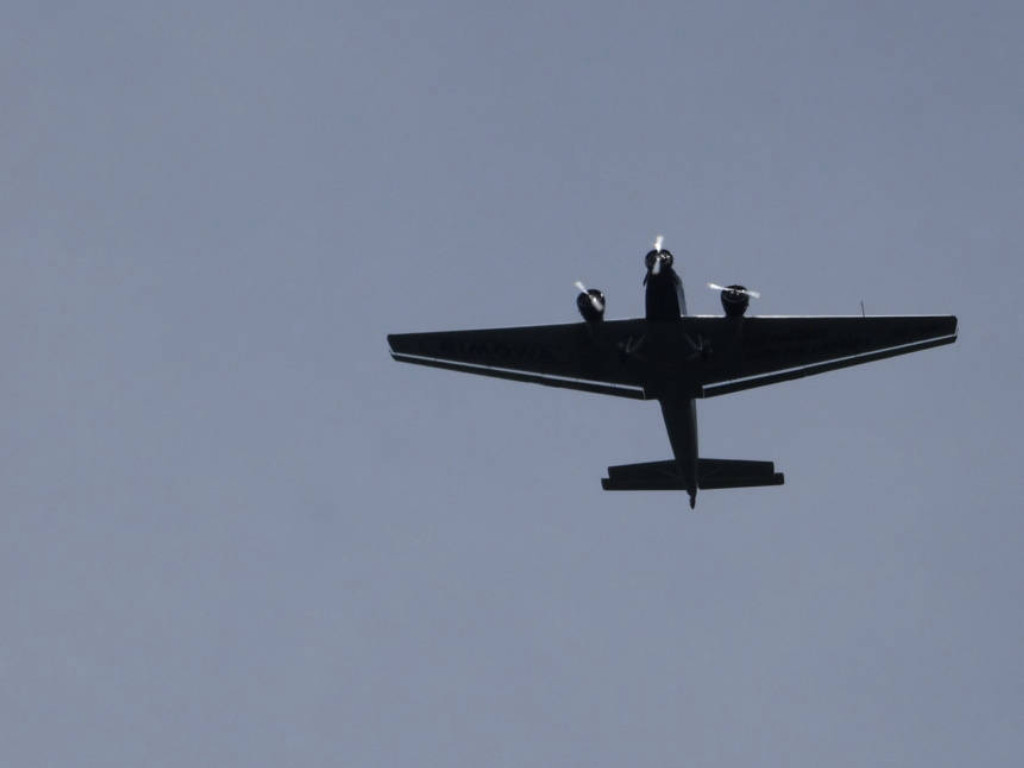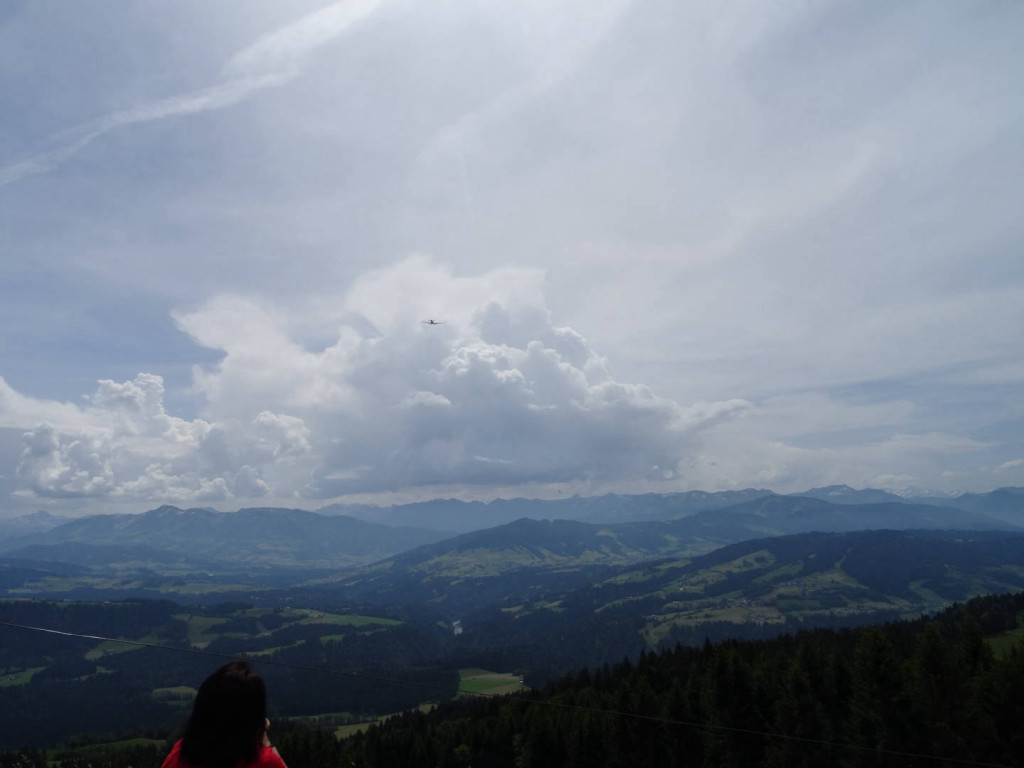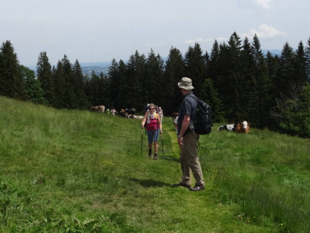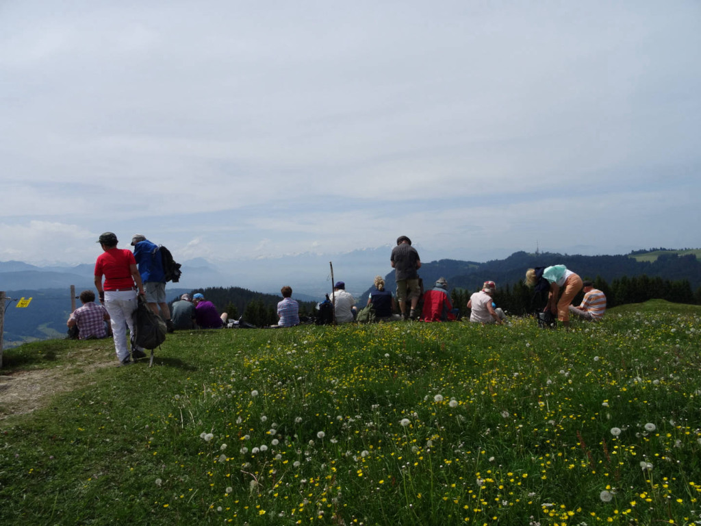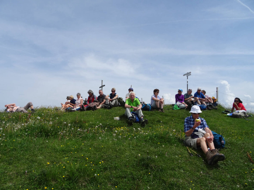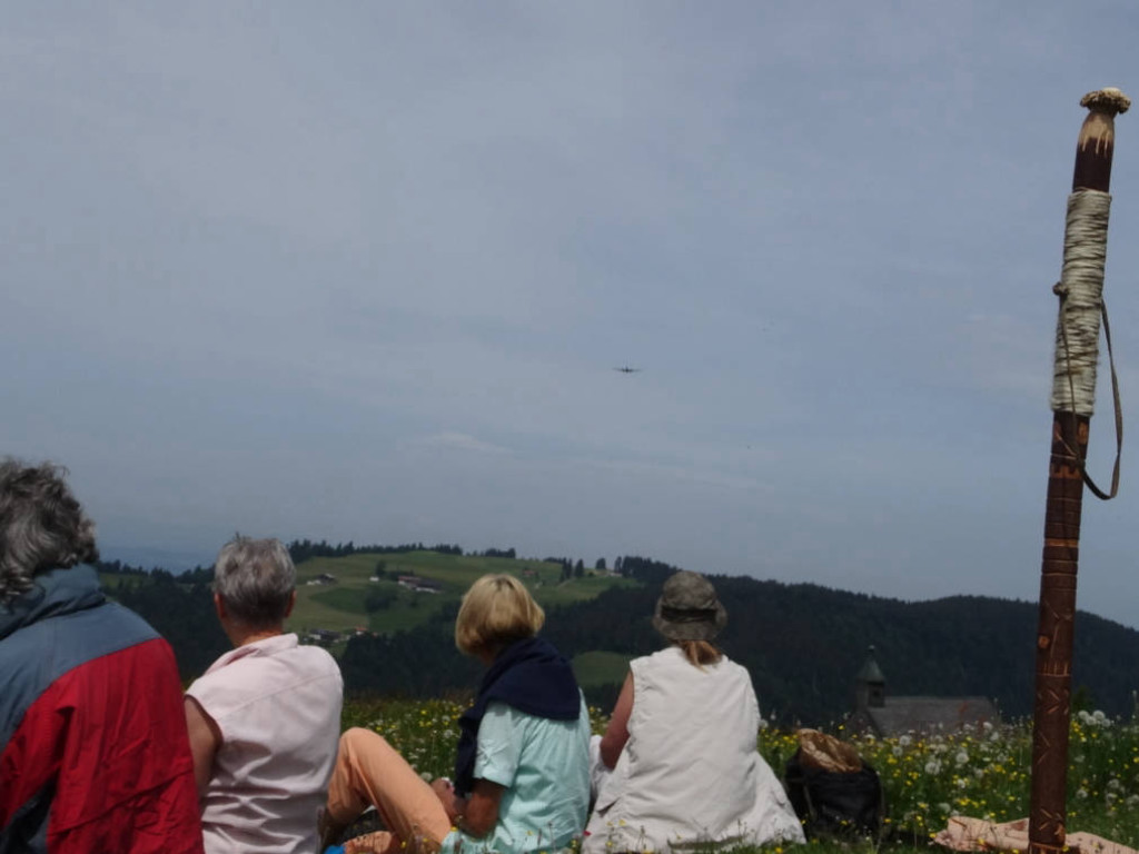 Kurz vor dem Gipfel ging es noch durch eine Kuhherde aber danach war die gemütliche Vesper-Pause am Gipfel eingeläutet. Pünktlich, als alle es sich am Gipfel gemütlich gemacht hatten, flog über uns noch ein dreimotoriges Oldtimer-Flugzeug und ließ sich bewundern.