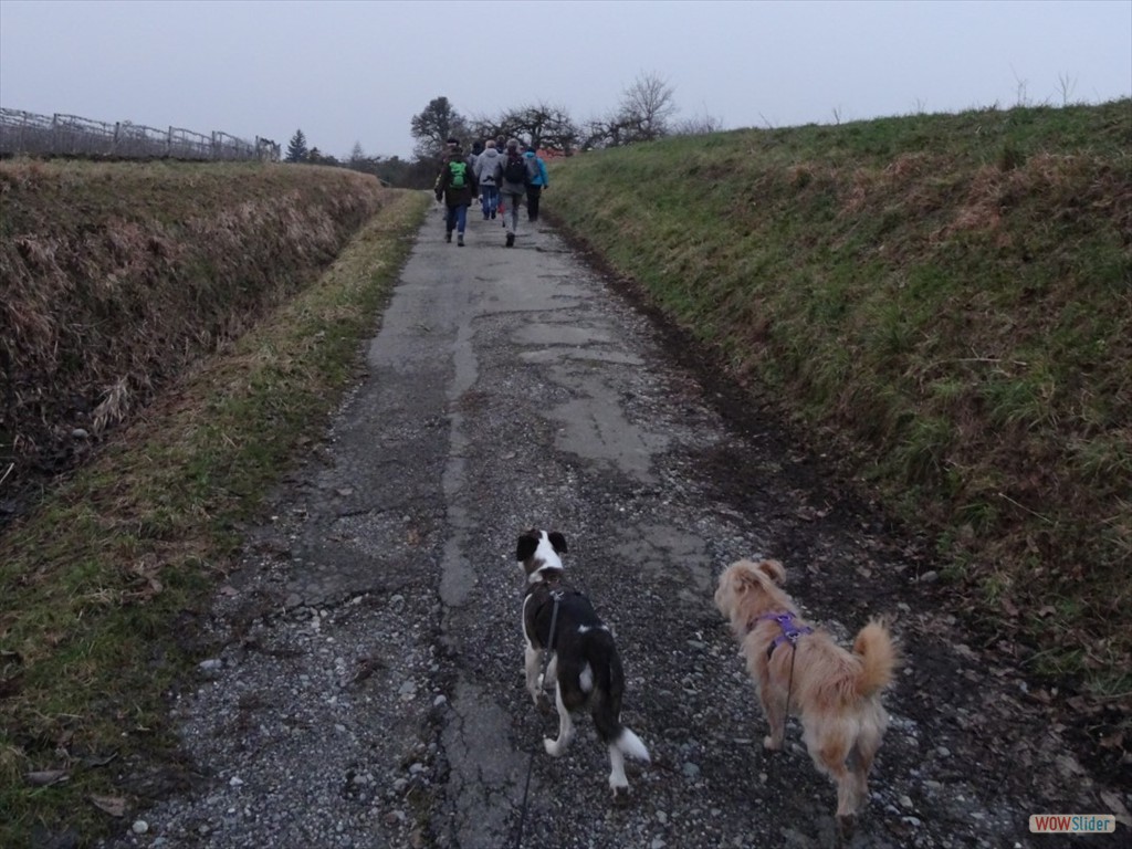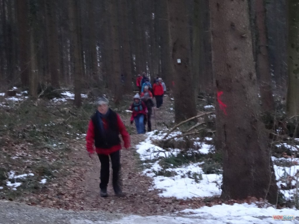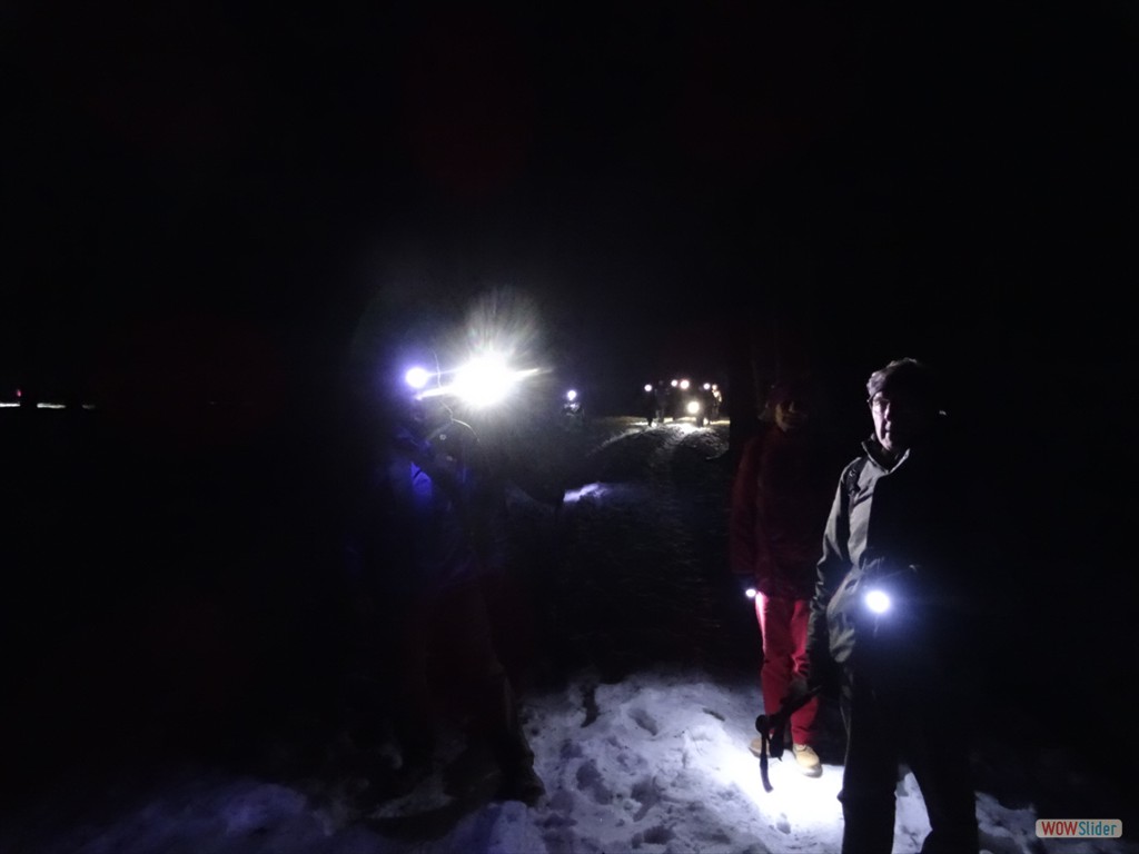 Dort entschloss ich mich dann den Weg ein wenig abzukürzen da uns der Sonnenuntergang von den Wolken versperrt war. Also Stirnlampe auf, denn auch den Vollmond wollten uns die Wolken nicht zeigen, und querfeldein über das verschneite Feld, was dazu führte, dass wir alle kräftig unsere Oberschenkelmuskulatur trainierten. Dann ging es hinein in den Wald und die Wege wurden wieder glatter so dass wir uns alle sehr auf den Weg konzentrierten mussten und auch unser Gleichgewicht wurde gefordert. Leider konnten wir uns dadurch wenig in der Dunkelheit umschauen und die nächtlichen Umrisse der Bäume anschauen.