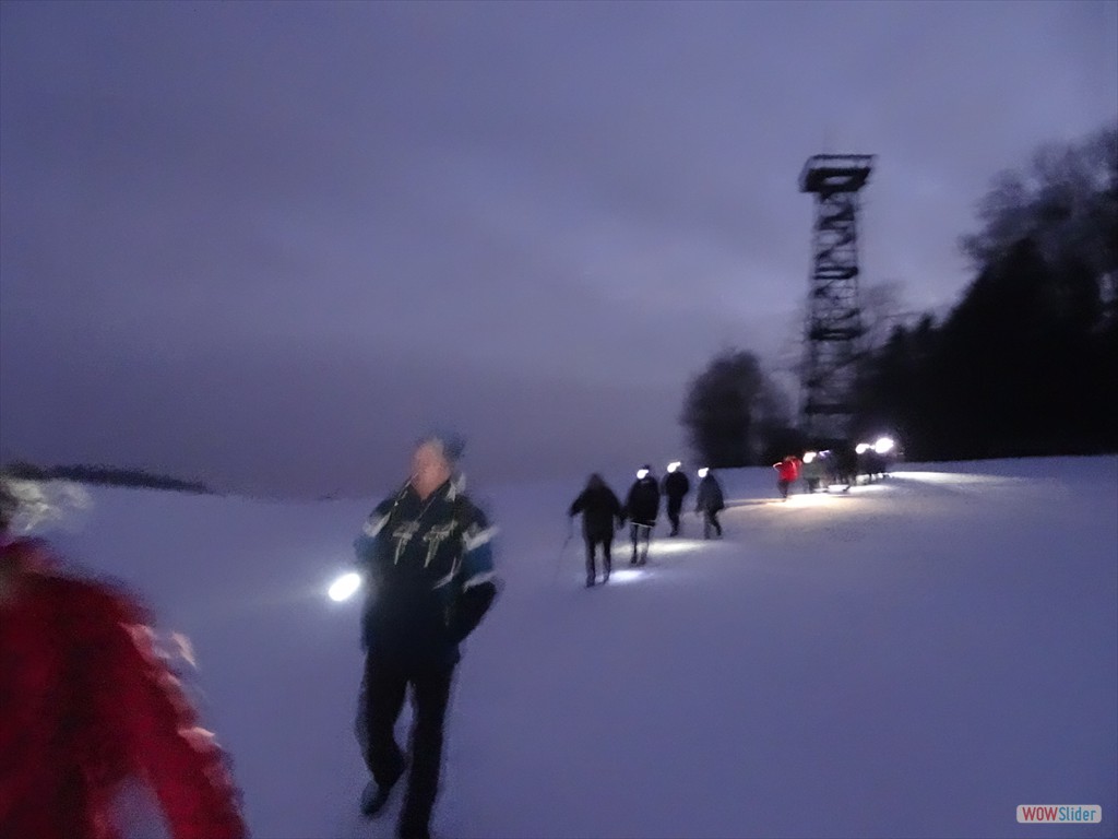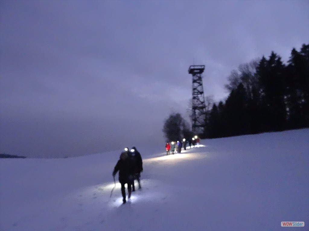 Fast pünktlich um 15:50Uhr habe ich den Bahnhof Markdorf erreicht um kurz und knapp die Autos zu füllen und nach Hepbach zu fahren. Dort warteten auch schon einige Wanderfreunde und so kam es das 20 Leute mit mir in die Dunkelheit gehen wollten. Das Wetter war trocken und angenehm kalt. Jedoch versperrten uns die Wolken die Sicht auf die am Anfang noch scheinende Sonne und leider auch die Sicht auf die Berge. Gemütlich fing die Wanderung an bis wir ab Möggenweiler immer weiter hinauf gingen. Ab dort gaben nämlich nicht mehr wir das Tempo an sondern der doch zum Teil vereiste Weg. Aber pünktlich zur Dämmerung haben es aller wohlauf bis zum Gehrenbergturm geschafft